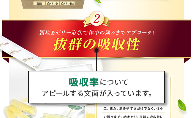 吸収率を高める工夫は、商品の大きな特長となります。大きくアピールするために、広告、パッケージ、商品紹介ページなどに記載している企業がほとんどです。