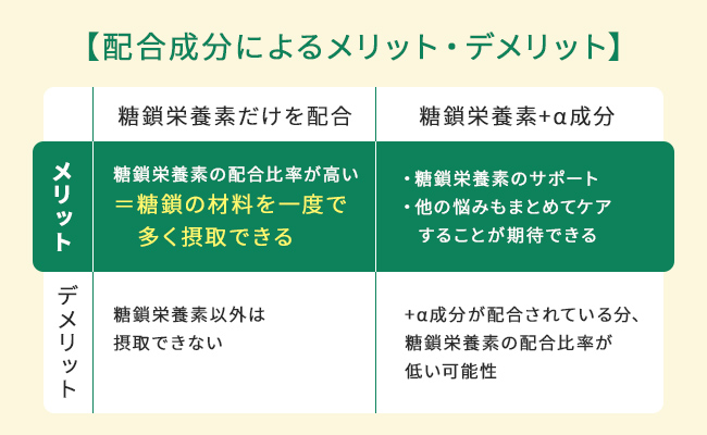 「糖鎖栄養素だけの商品」「糖鎖栄養素+α成分の商品」には、それぞれメリット・デメリットが存在します。